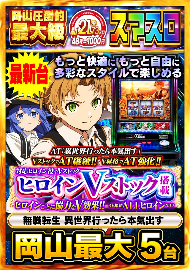 - 4パチ:384台 1パチ:288台 21.73スロ:524台 6.25スロ:76台