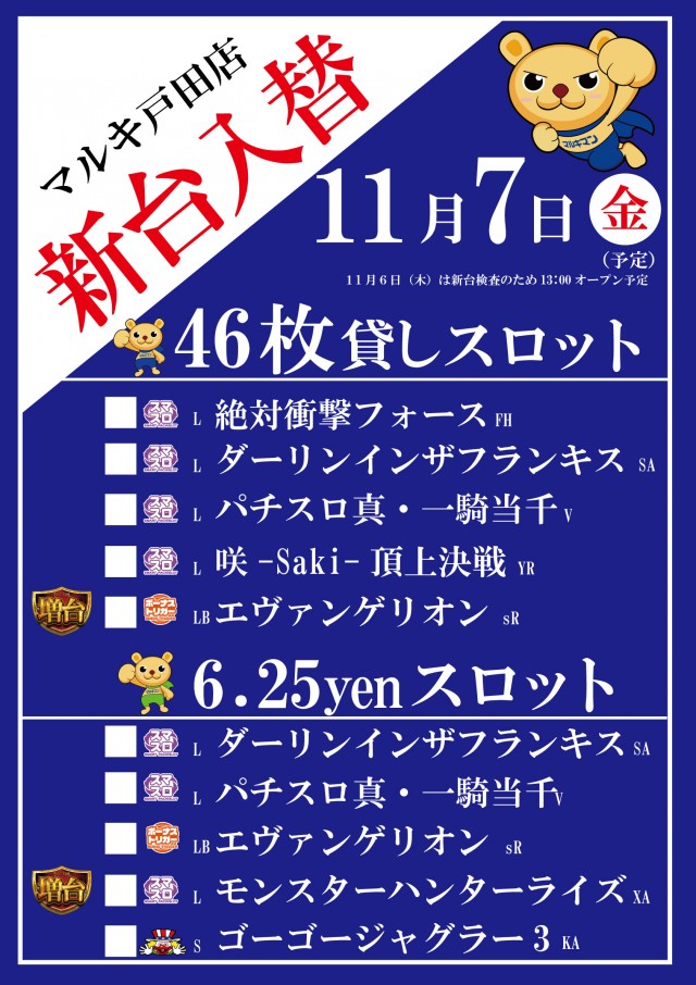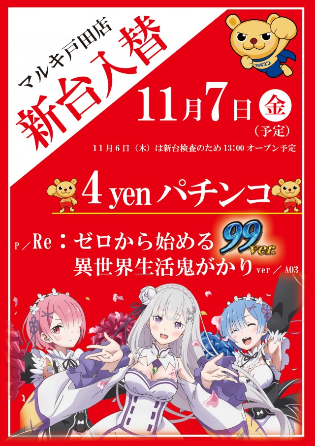 - 10:00入場開始!並んだ順での入場となります(新台入替前日は検査の為、13:00に入場開始となります)