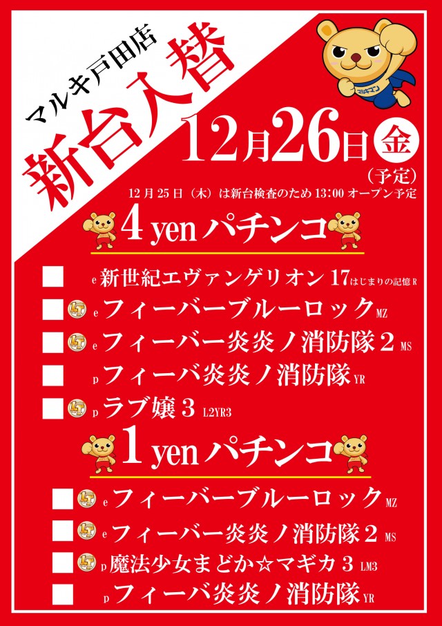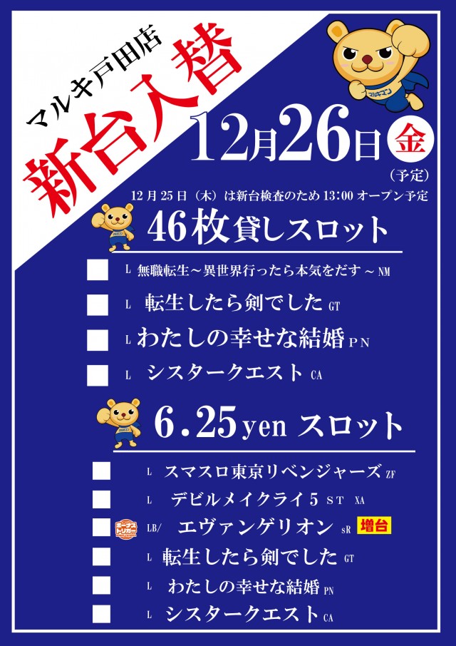 - 10:00入場開始!並んだ順での入場となります(新台入替前日は検査の為、13:00に入場開始となります)