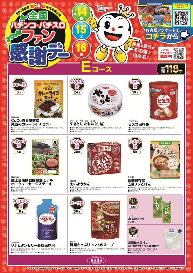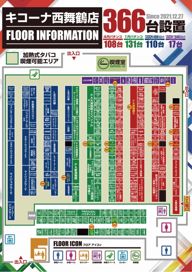 - 4パチ:107台 1パチ:131台 1000円/46枚スロ:110台 1000円/184枚スロ:17台