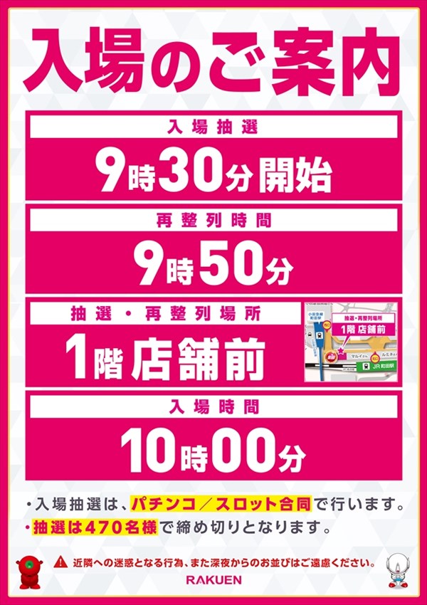- パチンコ・スロット合同抽選会となります。参加ご希望のお客様は【9:30までに1階店舗入り口】までお越しください。