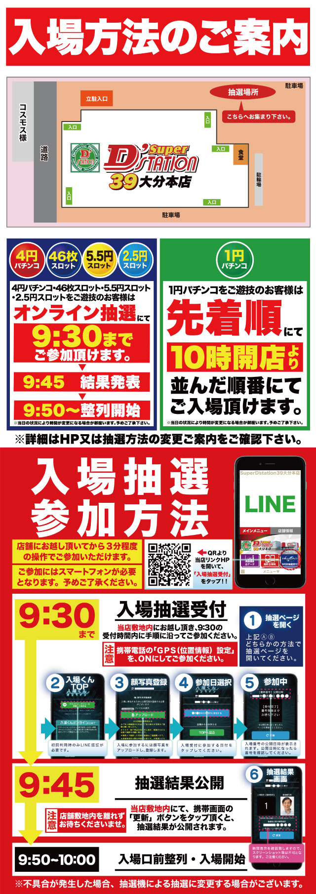 - 9時30分オンライン抽選締切。1円パチンコ、0.5円パチンコご遊技ご希望のお客様は先着順になります。