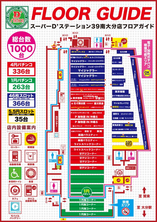 - パチンコ・スロット全台 「各台計数のパーソナル」導入! セルフカウンター設置で会員様なら更に便利! 大型休憩コーナーや綺麗な喫煙所も完備。 加熱式タバコ喫煙可能エリア設置! ※一部禁煙エリアあり