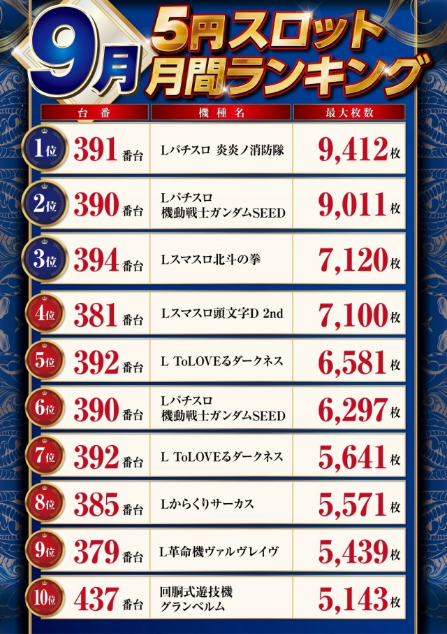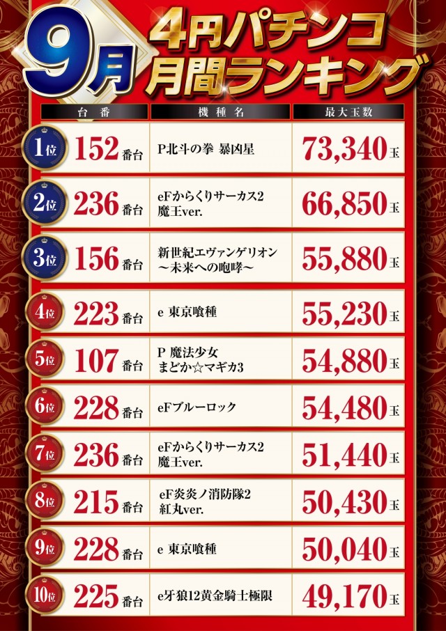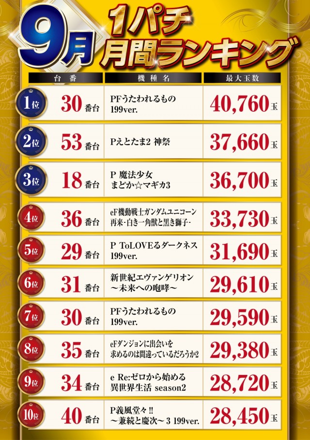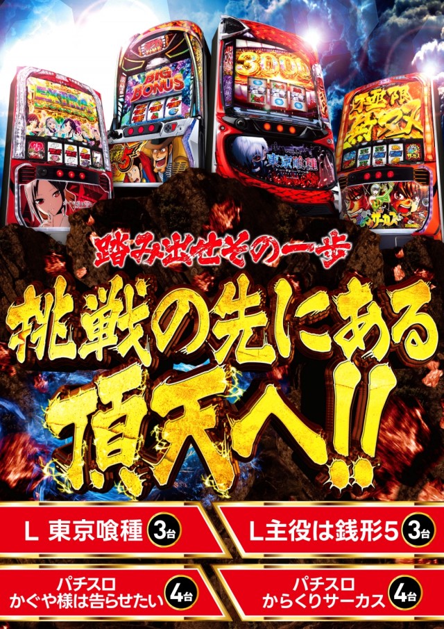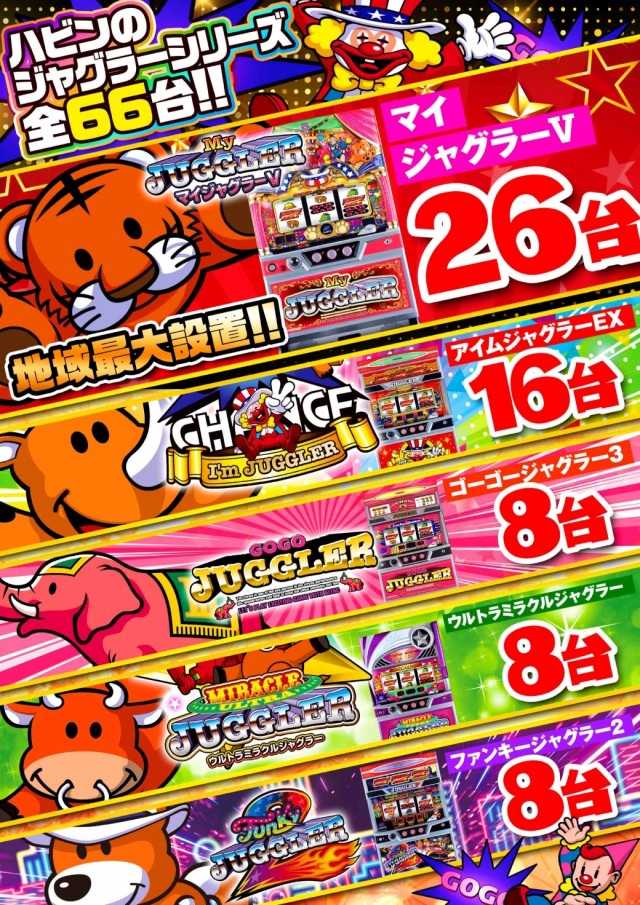 - [1000円/250玉]パチ:128台 [1000円/890玉]パチ:96台 [1000円/46枚]スロ:186台 [1000円/200枚]スロ:32台