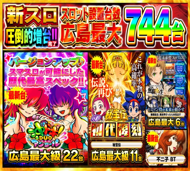 - ◆日本初防災特化型店舗 ◆広島最大1502台 だから出来る 設置機種ラインナップ ◆会員カードが超お得 【貯玉無制限】 ◆広々とした楽々台間スペース ◆パチンコ・スロット 全台各台計数機設置 ◆完全除菌・消臭ルーム ◆完全コロナ対策 ◆休憩ルーム コミック3000冊以上、 全席USBポート完備 ◆Wi₋fi完備 ◆VIP喫煙ルーム ◆マッサージコーナー 女性専用あり ◆飲食コーナー
