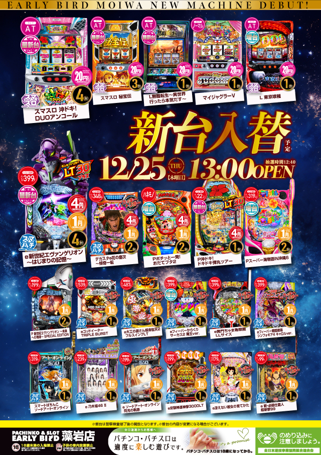 - [1000円/232玉]パチ:80台 [1000円/890玉]パチ:128台 [0.4]パチ:14台 [1000円/46枚]スロ:171台 [1,000円/160枚]スロ:28台