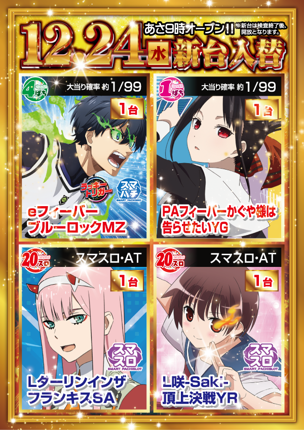 - [1000円/232玉]パチ:64台 [1000円/892玉]パチ:128台 [1000円/178枚]スロ:64台 [1000円/46枚]スロ:128台