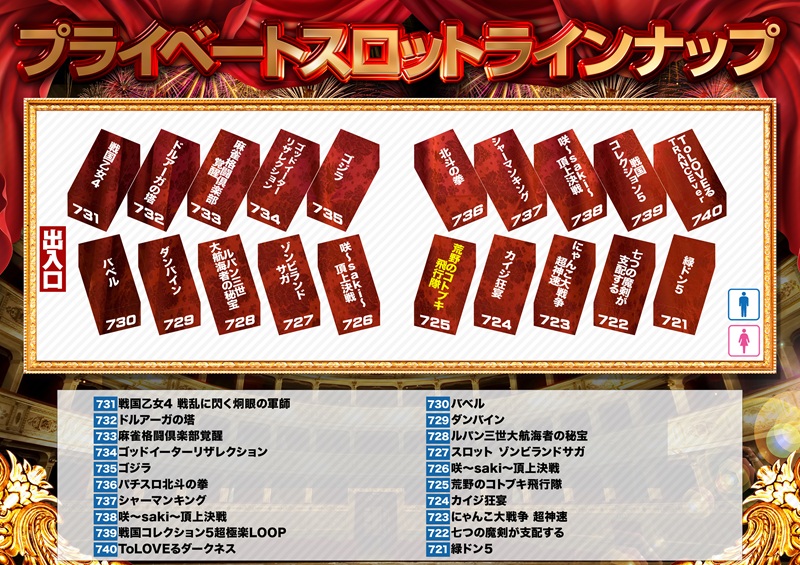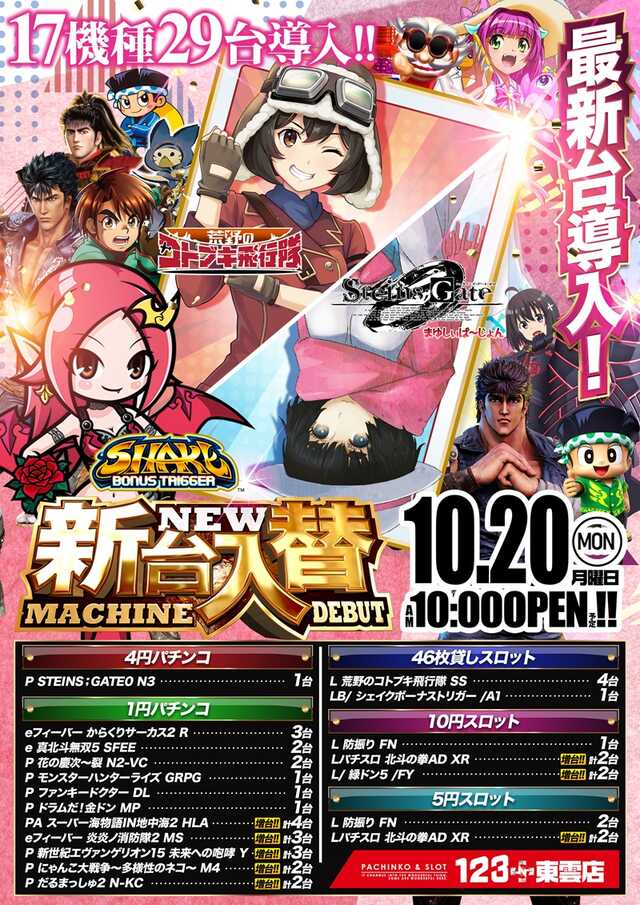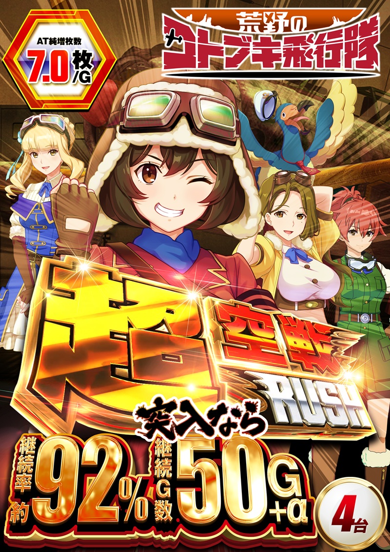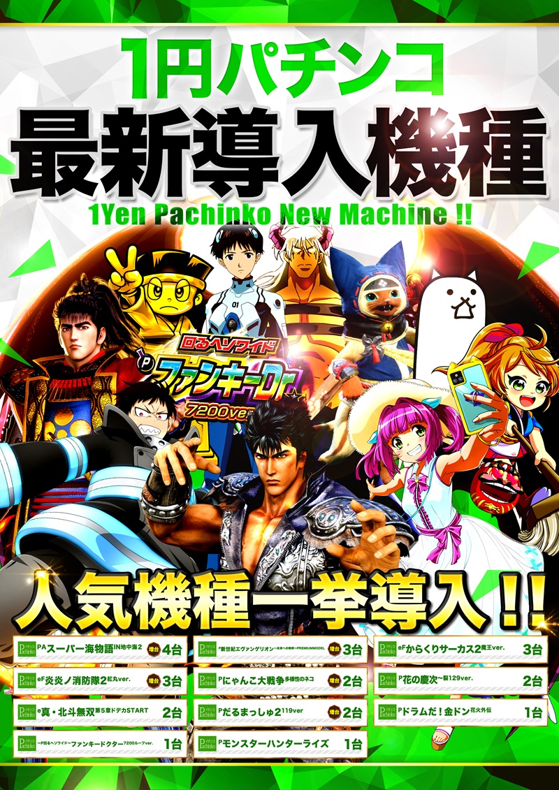 - 4パチ:360台 1パチ:200台 1000円/46枚スロ:387台 1000円/92枚スロ:40台 1000円/184枚スロ:80台