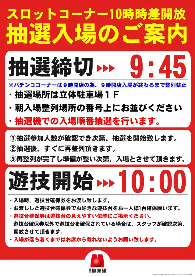 - 朝8:30までにお集まりのお客様を対象に抽選入場とさせて頂きます。※8:30以降にお越しのお客様は一般入場とさせて頂きます。