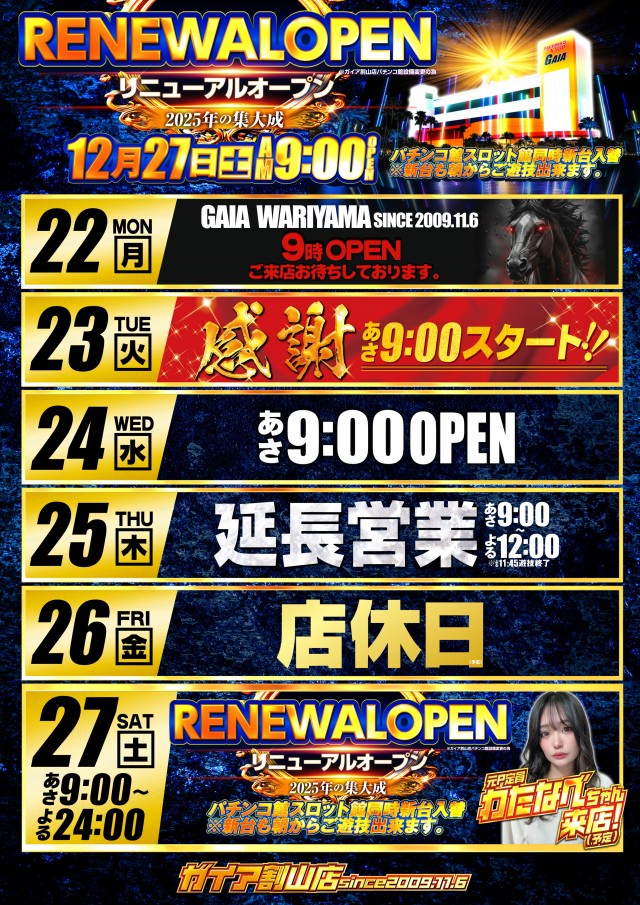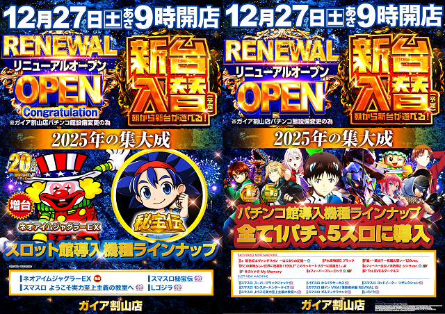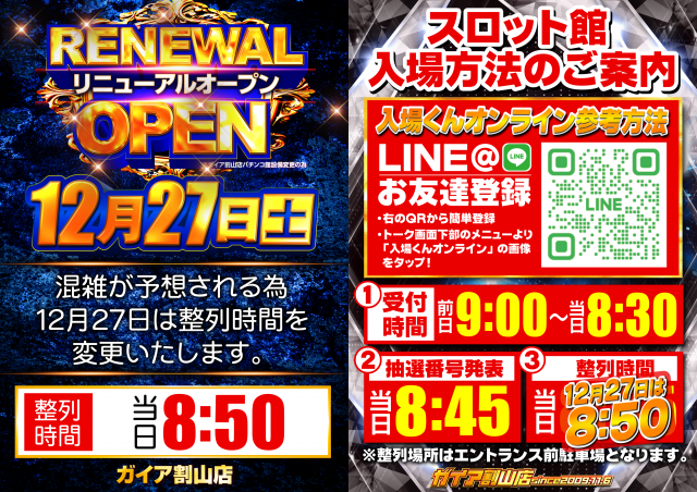 - スロット館は前日9時よりオンライン抽選、パチンコ館は当日8:40より順番整理券を配布いたします。