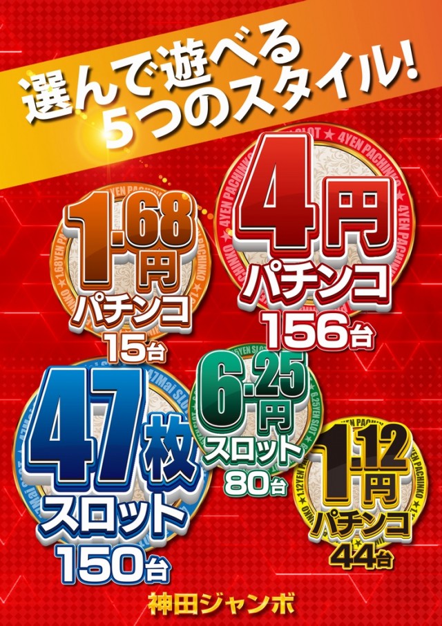 - [4]パチ:155台 [1.12]パチ:44台 [1.68]パチ:15台 [1000円/47枚]スロ:148台 [6.25]スロ:80台