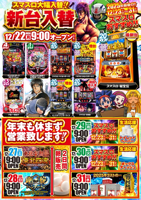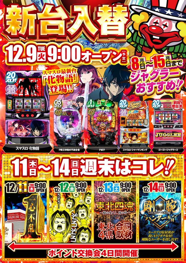 - [1000円/250玉]パチ:96台 [200円/178玉]パチ:64台 [0.562]パチ:32台 [1000円/46枚]スロ:84台 [1000円/178枚]スロ:28台