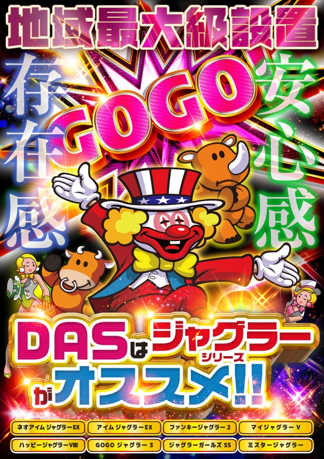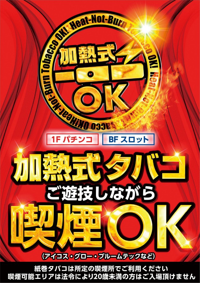 - ジャグラーシリーズ都内最大級60台設置! スロットフロアは加熱式タバコを吸いながらご遊技できます。