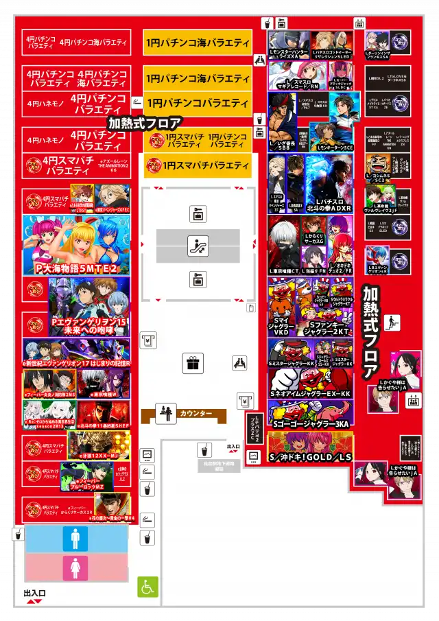 - [4]パチ:320台 [1]パチ:100台 [1000円/46枚]スロ:314台