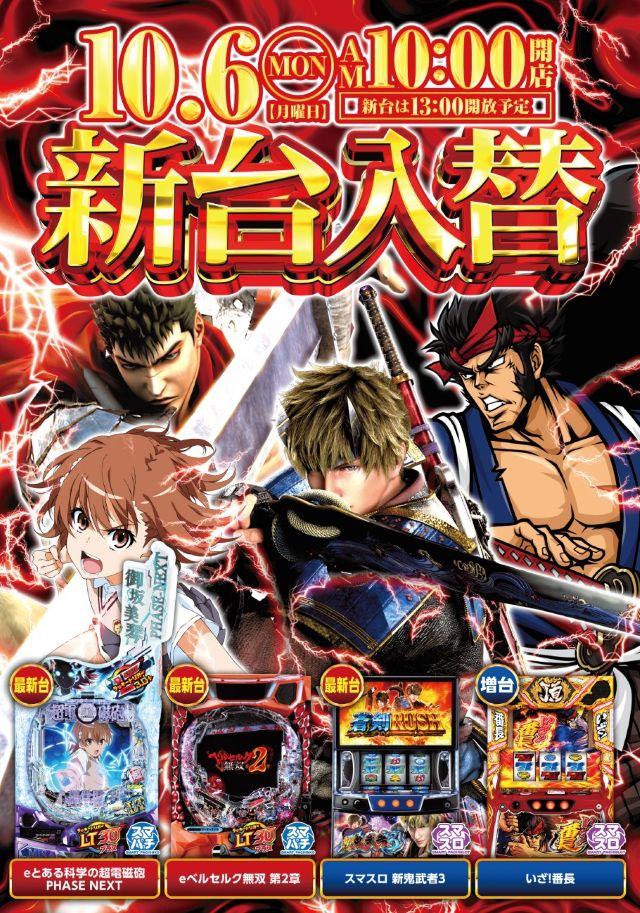 - 地域密着型店舗 2025年3月25日リニューアルオープン♪ スロットフロア60台から91台に拡大済み! 2024年7月3日発行新紙幣全台ご利用可能 館内全エリア高速wi-fi店内で使用可能 店内で遊技しながら喫煙可能です(加熱・電子タバコ)※紙タバコは専用喫煙ブースにて喫煙下さい 無料で利用できる駐輪場ございます。9:00~23:00迄 皆さまのご来店 スタッフ一同 お待ちしております。