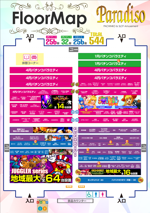 - 4パチ:256台 1パチ:32台 1000円/50枚スロ:256台