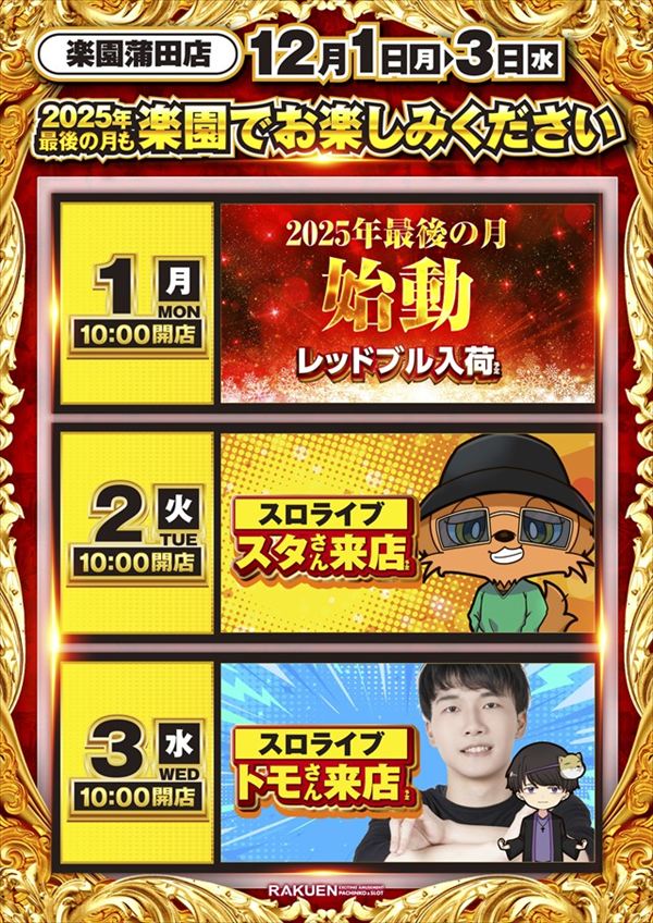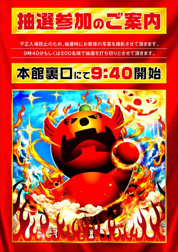- 店頭抽選:楽園蒲田店、本館裏口にて9:40~