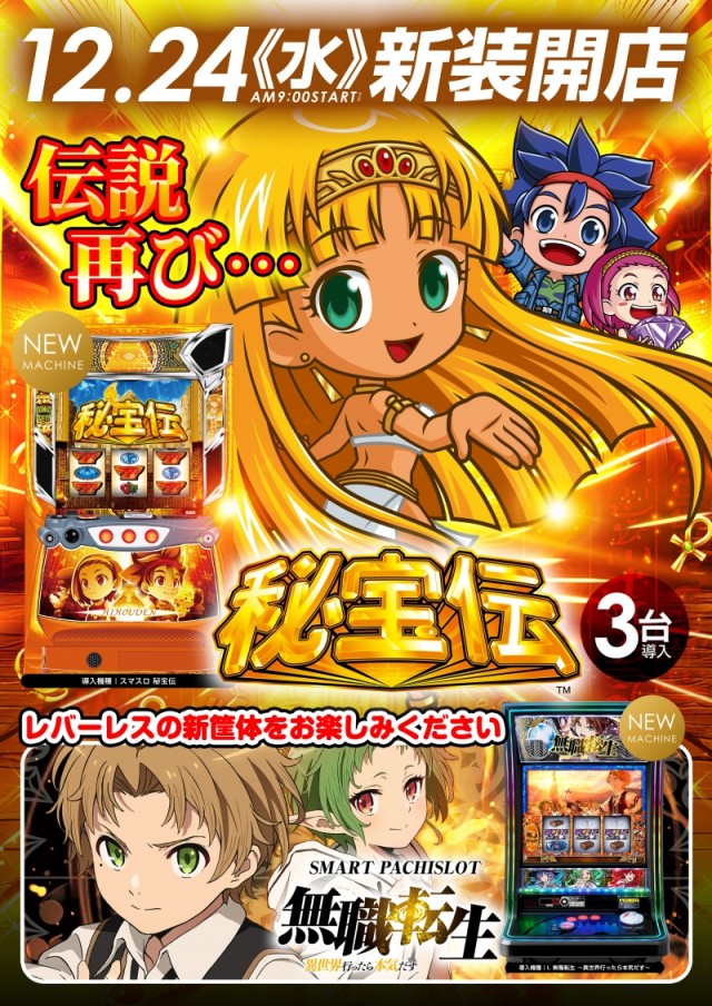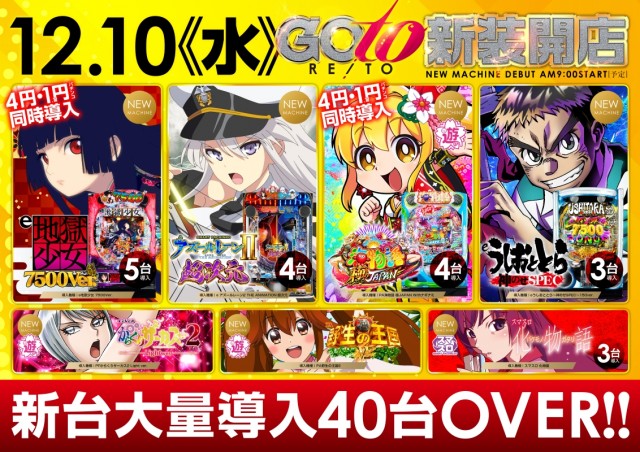 - [1.1]パチ:127台 [4]パチ:218台 [0.22]パチ:31台 [1000円/46枚]スロ:293台 [1000円/180枚]スロ:50台 [1000円/450枚]スロ:10台