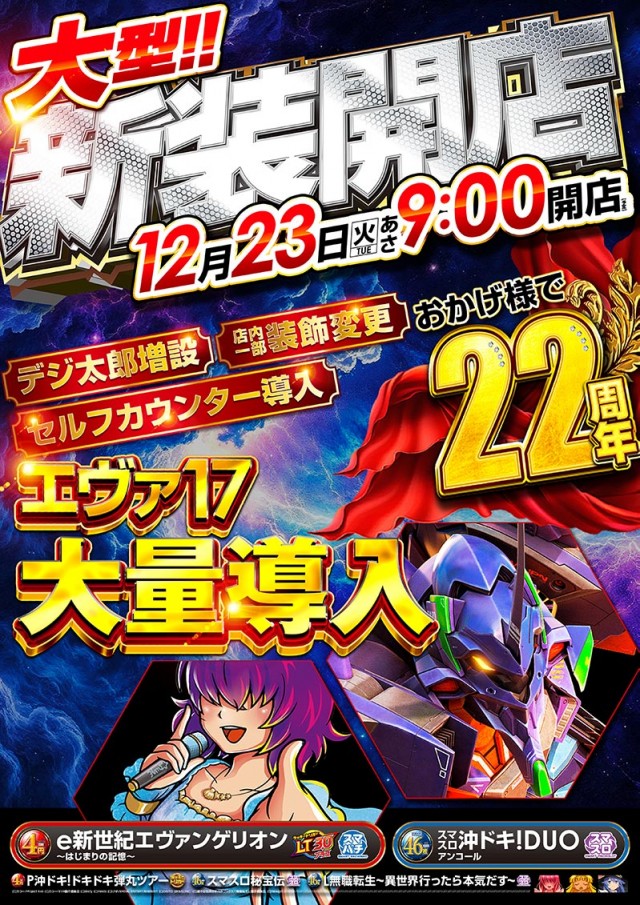 - 4パチ:320台 1.11パチ:280台 0.22パチ:40台 46枚スロ:400台 5.56スロ:40台 2.22スロ:40台