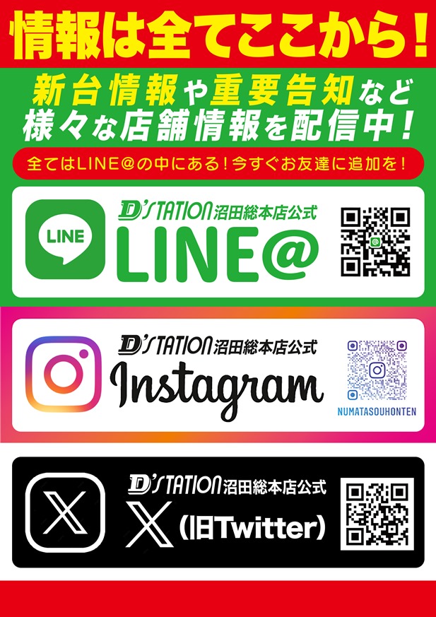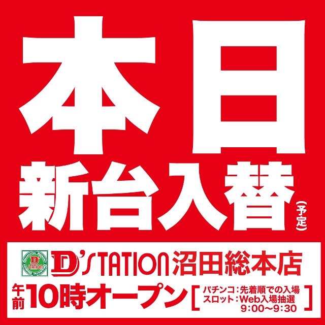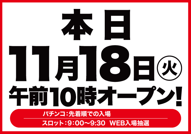 - パチンコ:先着入場 スロット朝9:00よりオンライン抽選開始(9:30オンライン抽選終了)
