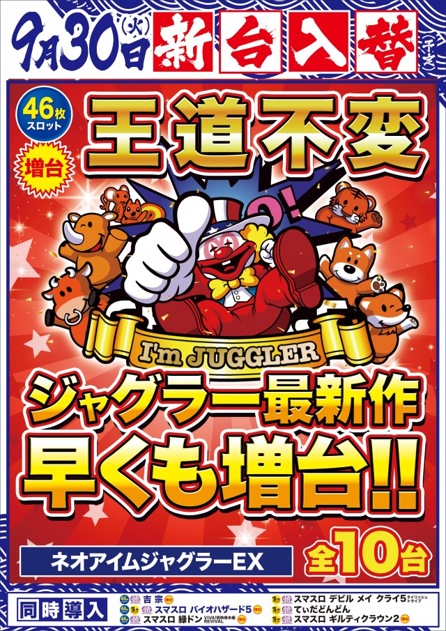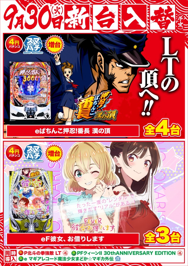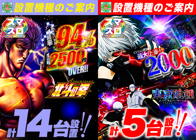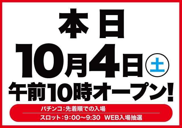 - パチンコ:先着入場 スロット朝9:00よりオンライン抽選開始(9:30オンライン抽選終了)