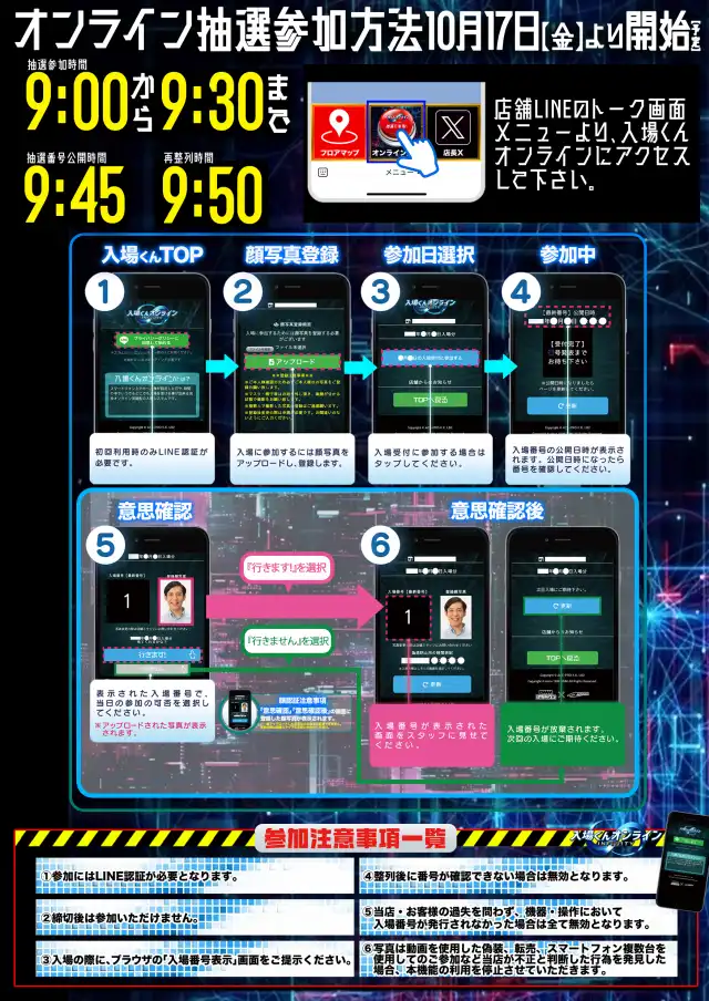 - 抽選開始:9:40~ ※抽選権の交換・売買などは禁止とし、発覚した際は以後の当店への出入り禁止をさせて頂きます。※いかなる理由に於いても9:40までにお並び頂いていないお客様は抽選に参加することができません。