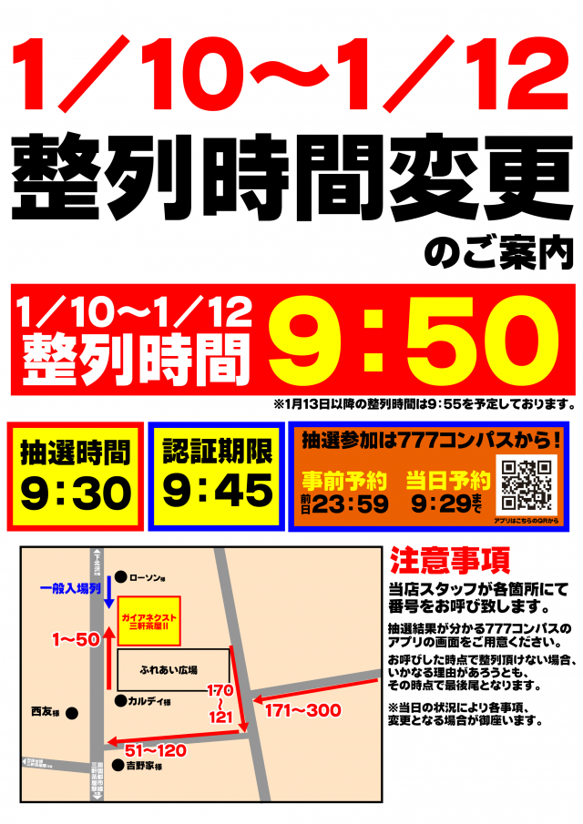 - 777CON-PASSにてオンライン抽選 9:30 認証期限 9:45 整列 9:55 開店入場 10:00予定