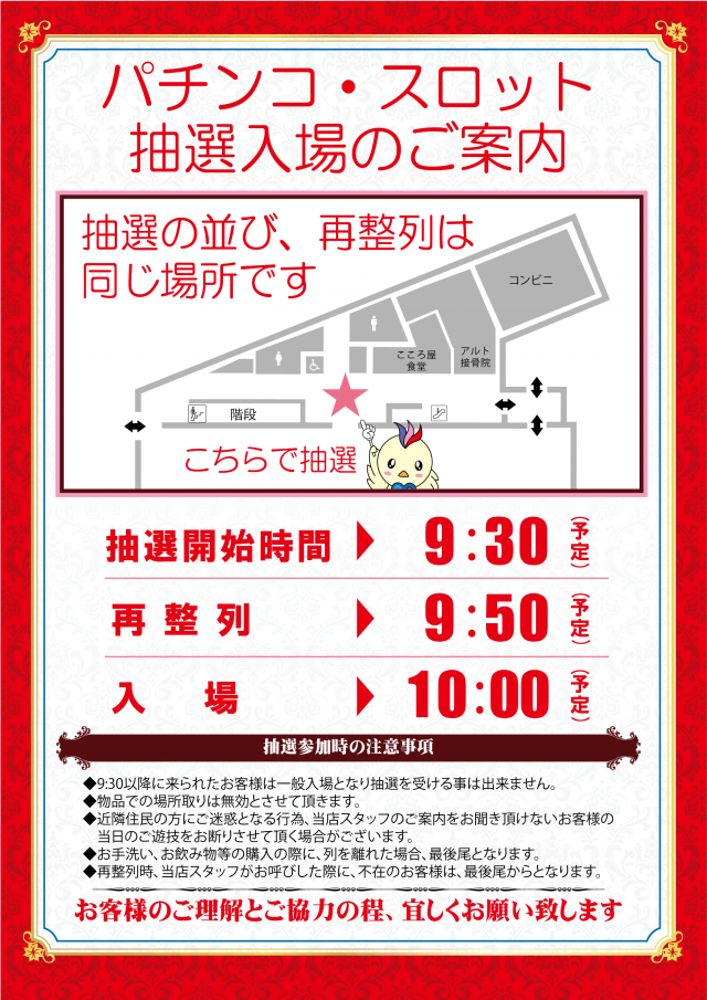 - 9:30~抽選開始、入替・開店時に整理券を発行する場合が御座います