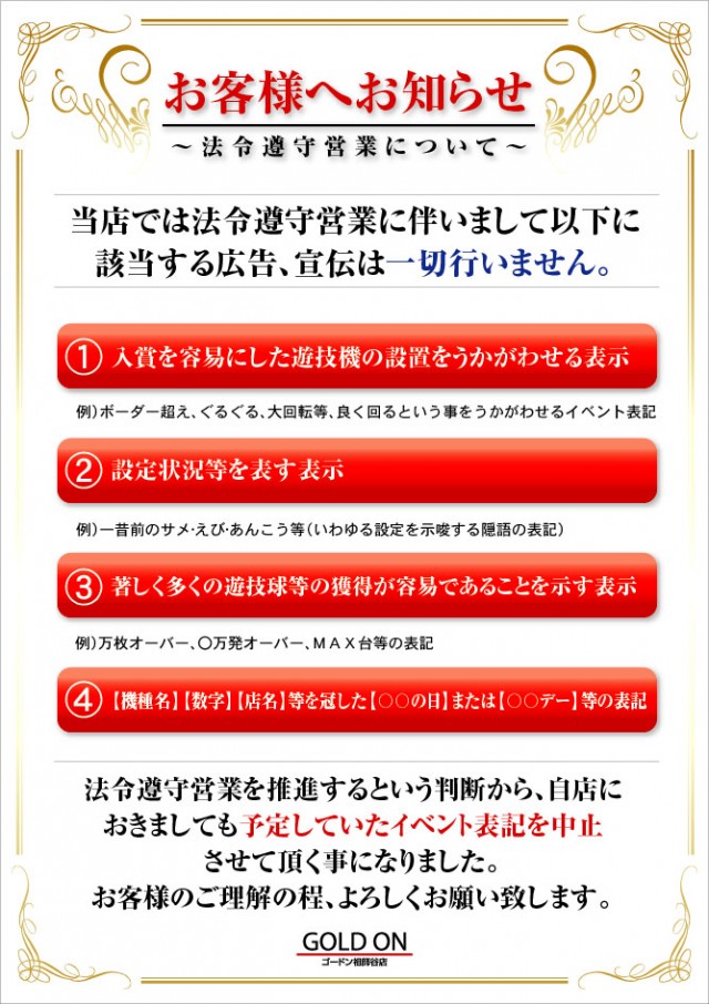 当店は、地域一番店を目指し、全てのお客様に遊空間を提供できます様日々努力して参ります。