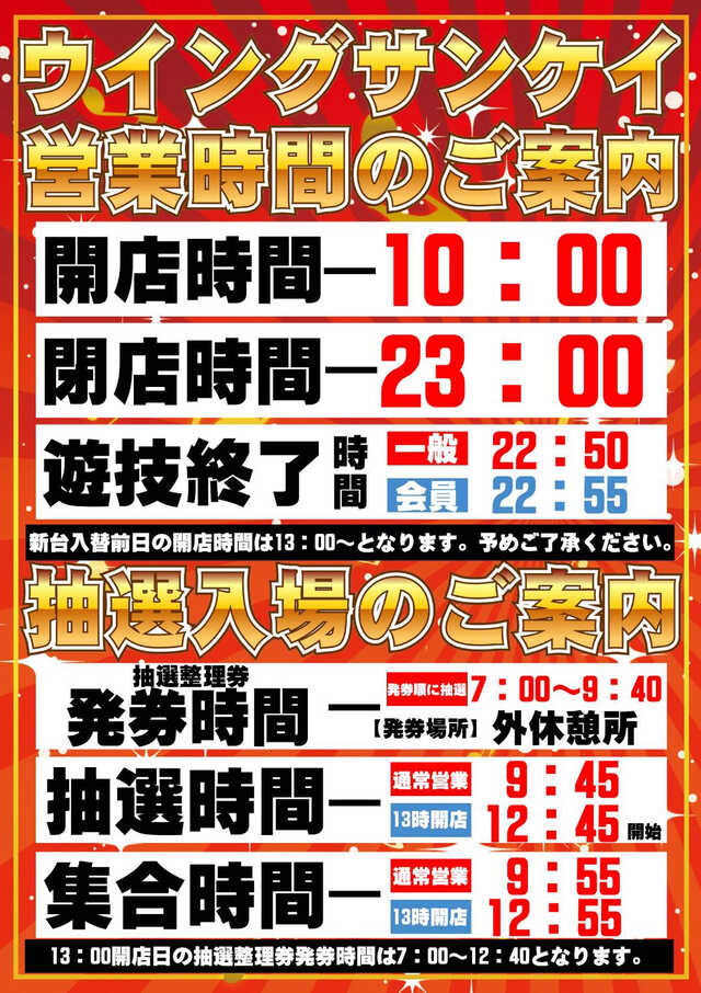 - 外休憩所にて7:00~9:45まで発券機で配布中(※13時開店の場合は7:00~12:45まで発券機で配布中)