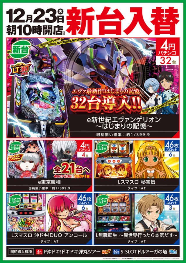 - パチ 4円 320台 1円 224台 計544台 スロ 1000円/46枚 413台 5円 82台 計495台 合計1039台