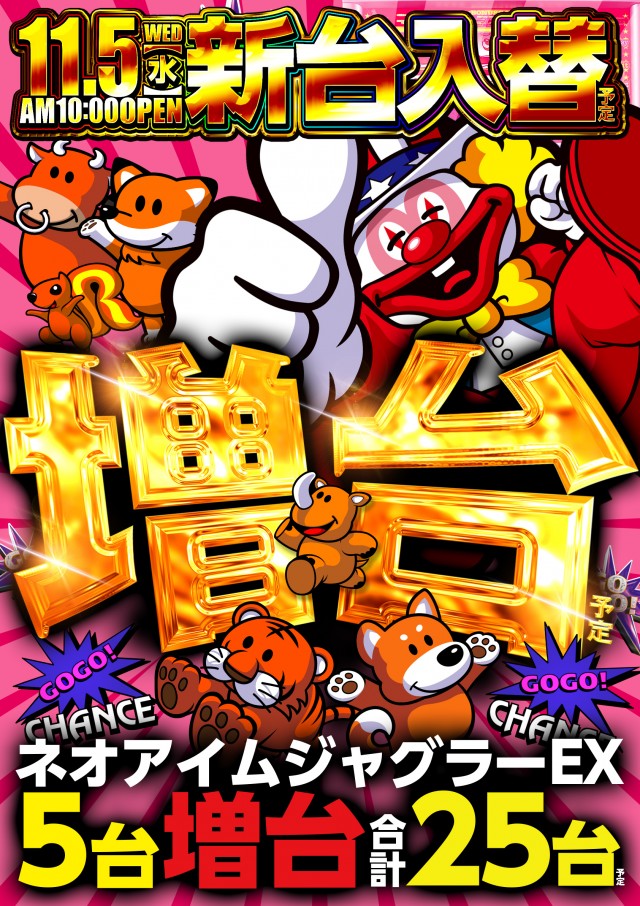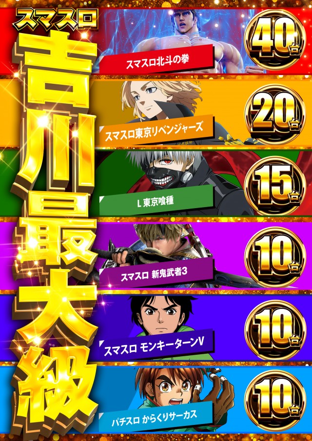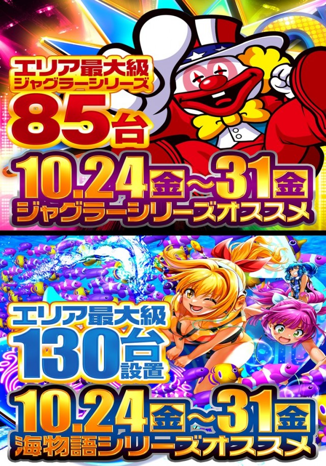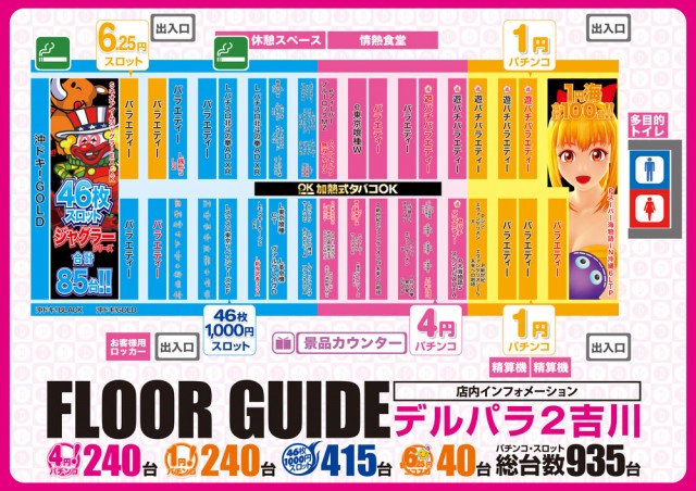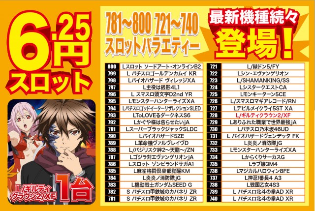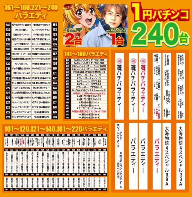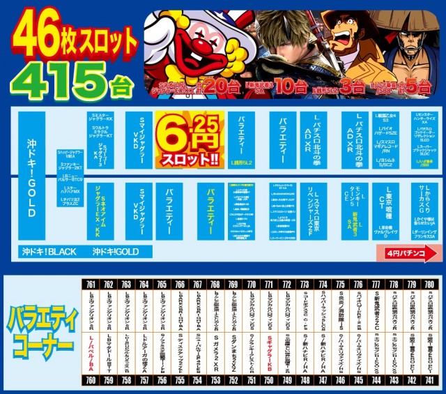 - [4]パチ:239台 [1]パチ:238台 [1000円/46枚]スロ:411台 [6.25]スロ:40台