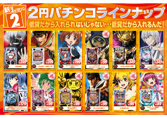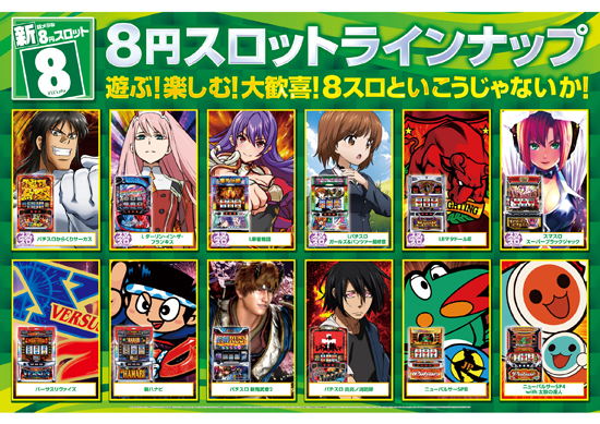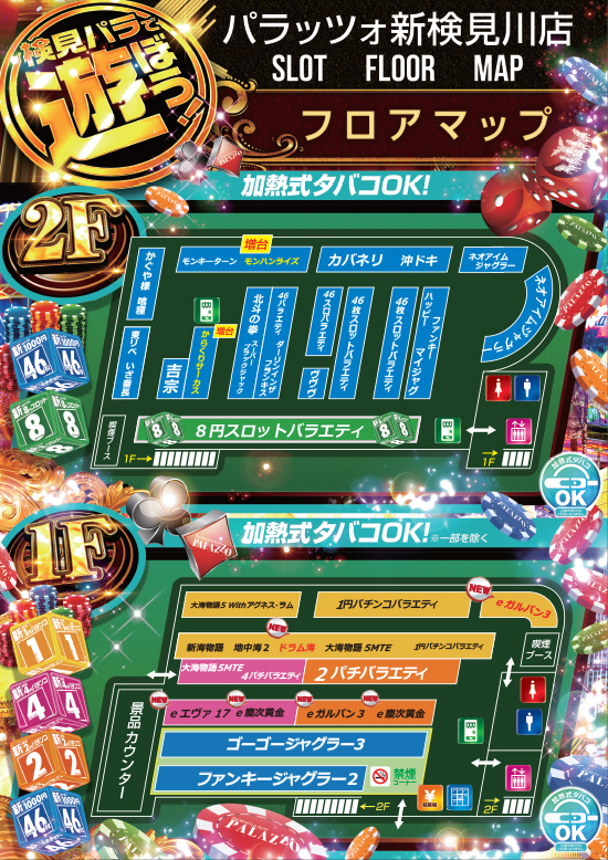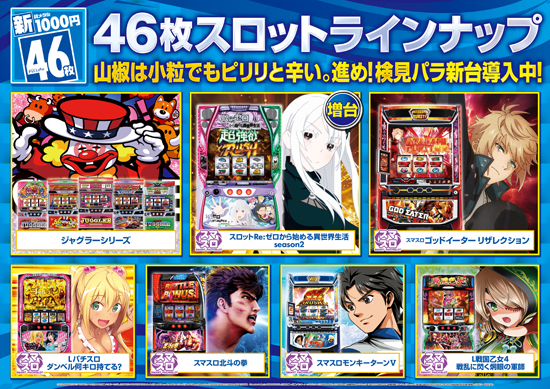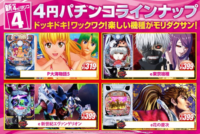 - [4]パチ:13台 [1]パチ:42台 [2]パチ:12台 [1000円/46枚]スロ:102台 [8]スロ:14台
