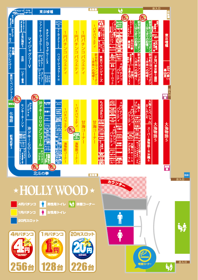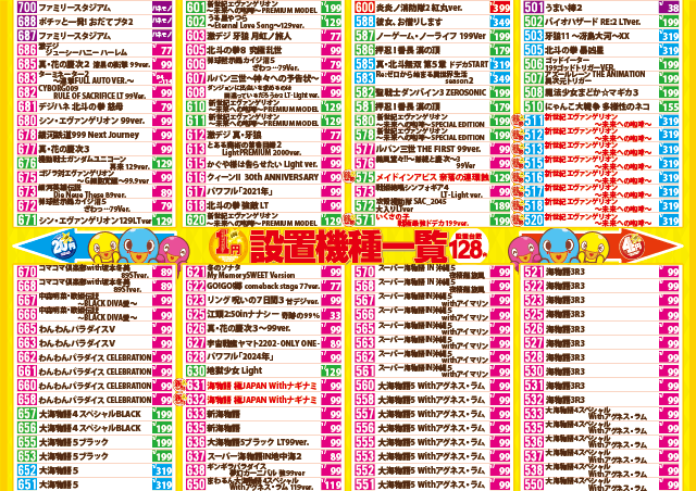 - [4]パチ:256台 [1]パチ:128台 [20]スロ:226台