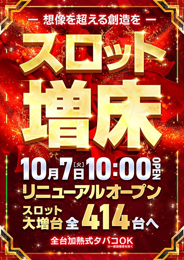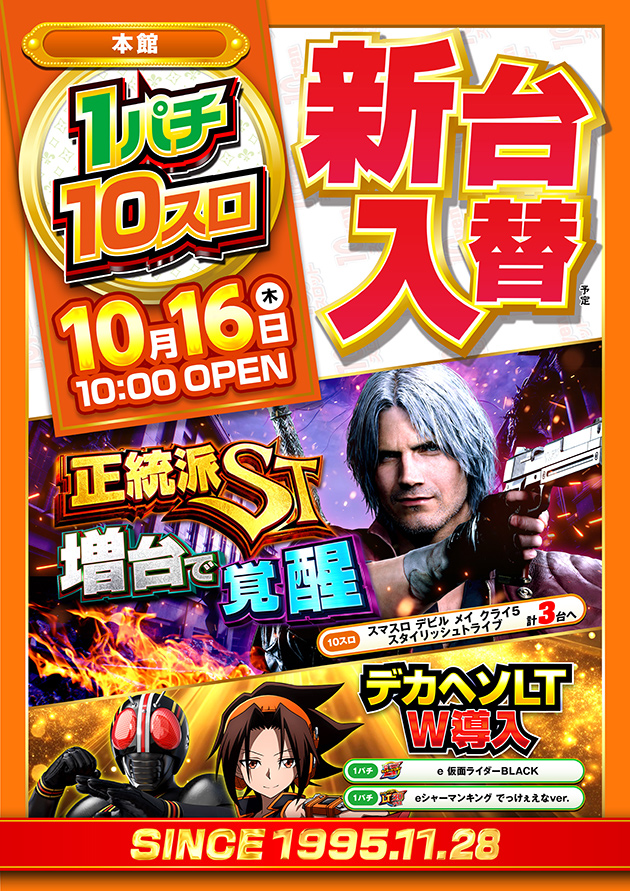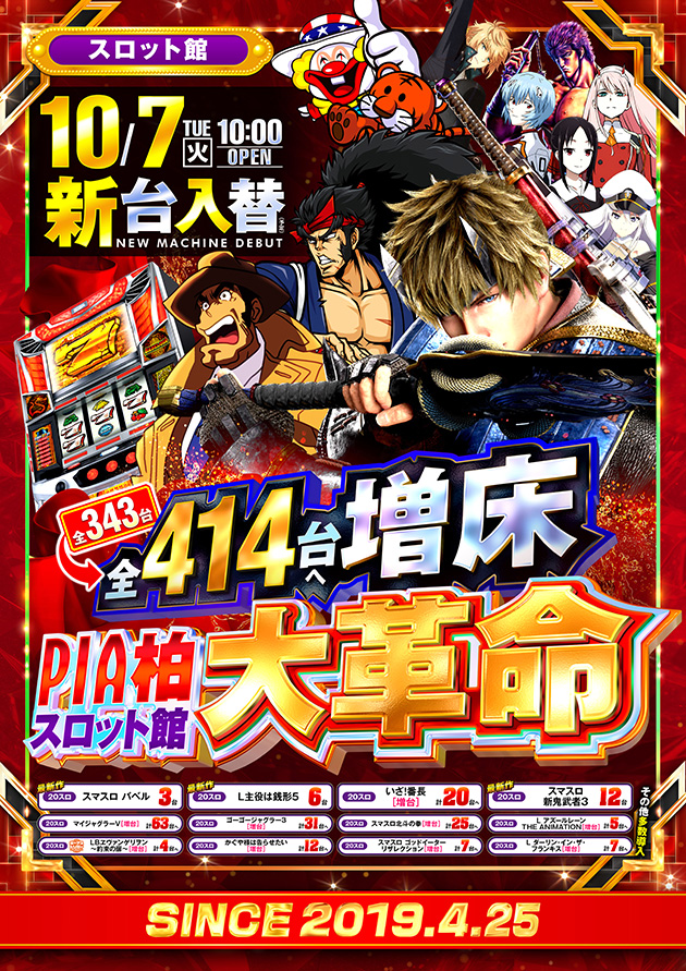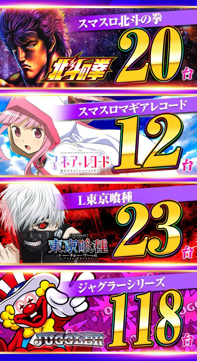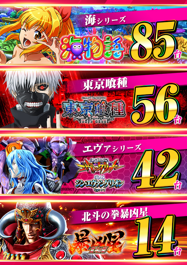 - [1]パチ:261台 [4]パチ:448台 [1000円/100枚]スロ:158台 [1000円/46枚]スロ:343台