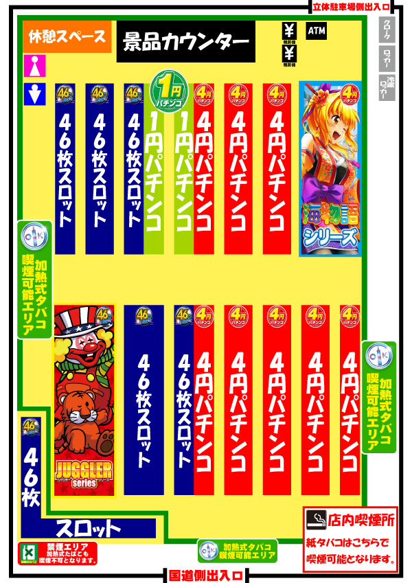 - [1]パチ:32台 [4]パチ:256台 [1000円/46枚]スロ:186台