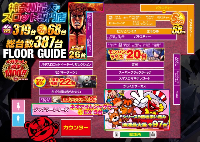 - [1000円/46枚]スロ:319台 [1000円/200枚]スロ:68台