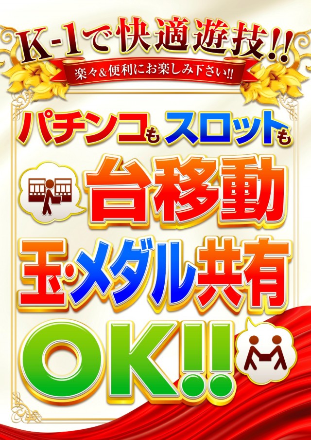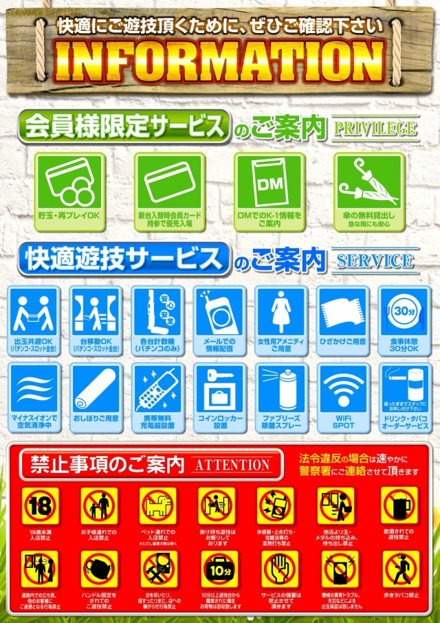 - ウイルス対策強化中!全台飛沫防止ボード設置・店内アルコール消毒設置 楽々遊技出来る各台計数機・マイナスイオン空気洗浄、除菌のエアパラダイス・最新のナンバーランプ他、各種快適遊技サービスを行っております。 会員様には最新台の優先入場、新台のDMでのお知らせ、貯玉再プレイOK、傘の貸出しサービスを行っています。