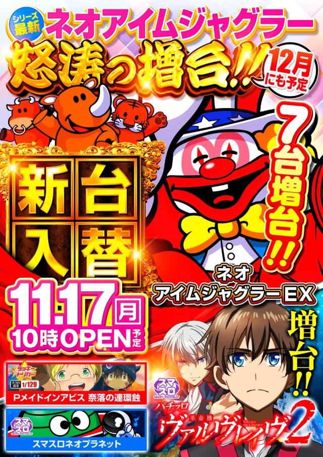 - 新台につきましては11時オープンとなります。新台は10時開店前に会員カード又はDMをお持ちの会員様からの先着順整列となります。一般のお客様は会員カード持参の会員様入場後のご案内とさせて頂きます。この機会に貯玉・再プレイ、新台優先入場特典のある会員カードの作成をお勧め致します。