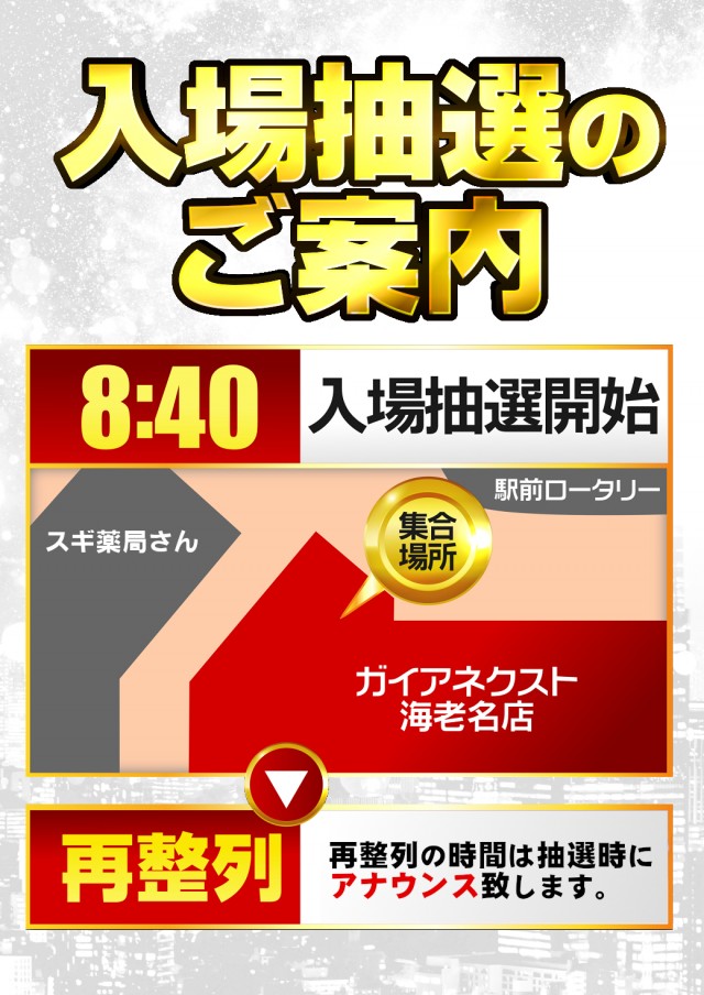 - 朝8:40に1F駅側入口にて順番決めを行います。