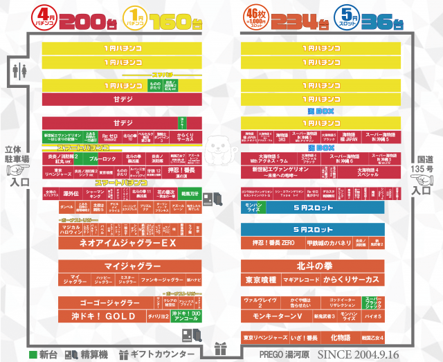 - [1]パチ:160台 [4]パチ:200台 [1000円/46枚]スロ:234台 [5]スロ:36台