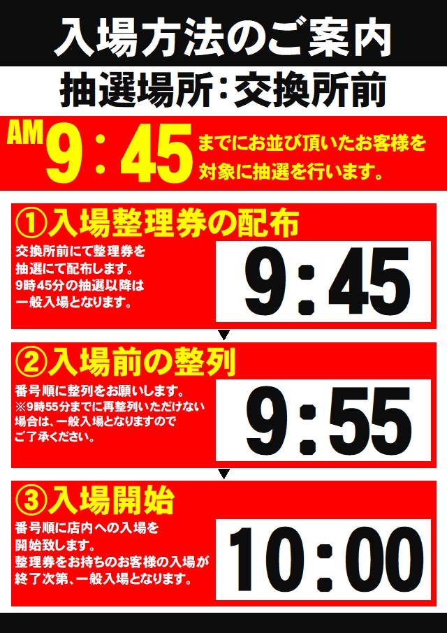 - 入場抽選は9:45までに正面入口にお並び頂いたお客様を対象に行います。