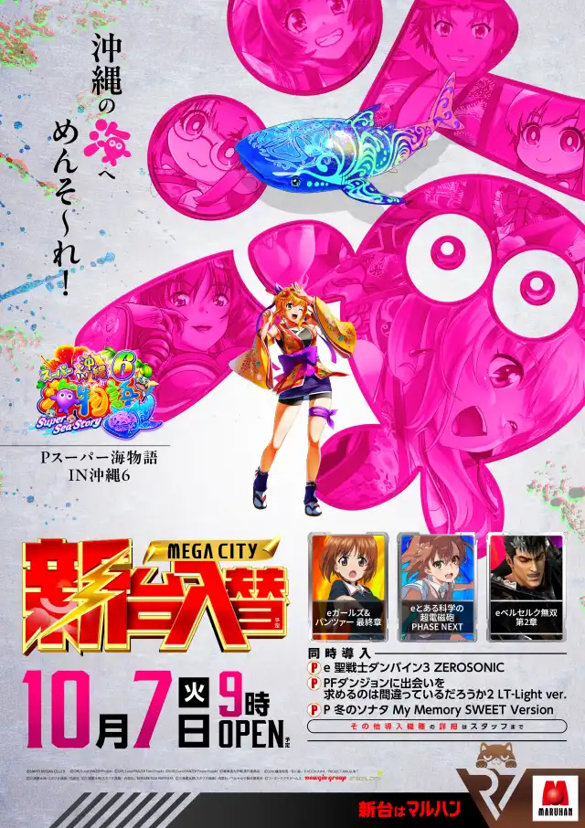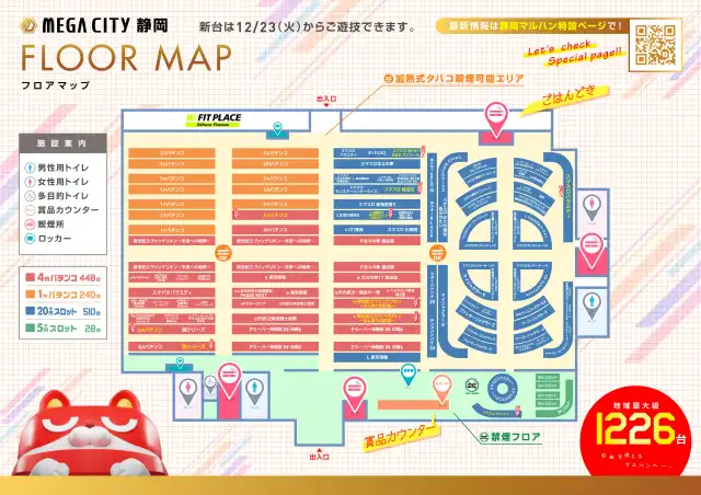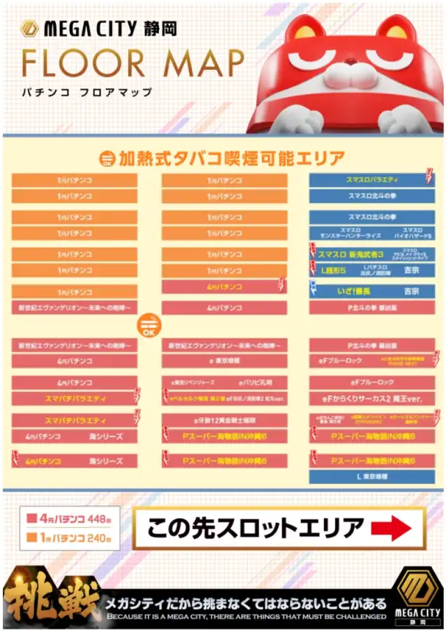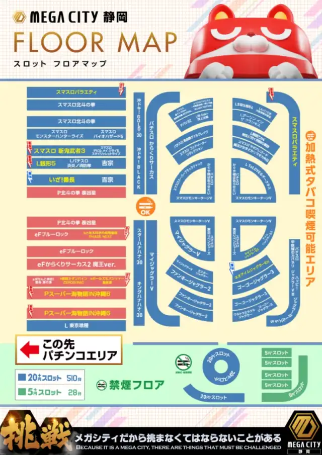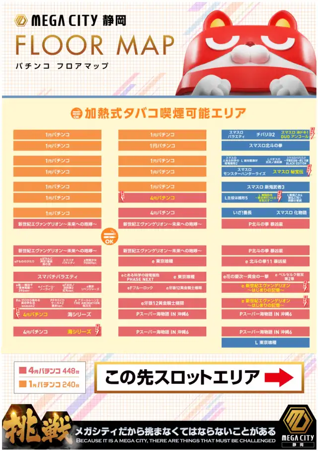 - 4パチ:448台 1パチ:240台 1000円/46枚スロ:510台 1000円/182枚スロ:28台