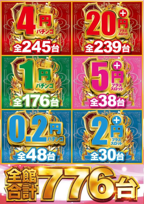 - [1]パチ:176台 [4]パチ:245台 [0.2]パチ:48台 [1000円/46枚]スロ:239台 [1000円/180枚]スロ:38台 [1000円/460枚]スロ:30台