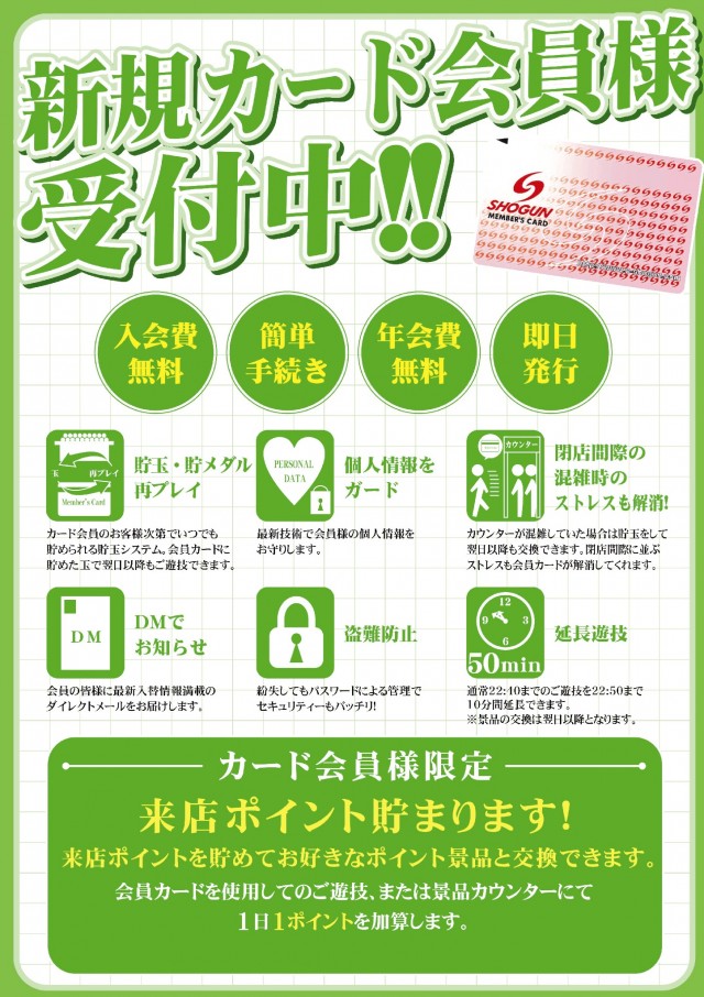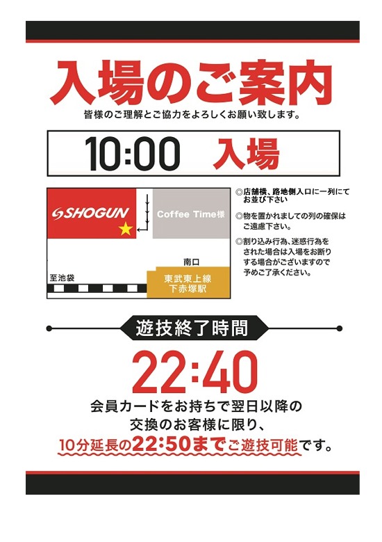 - 10:00~22:40(会員カード遊技終了時間22:50)