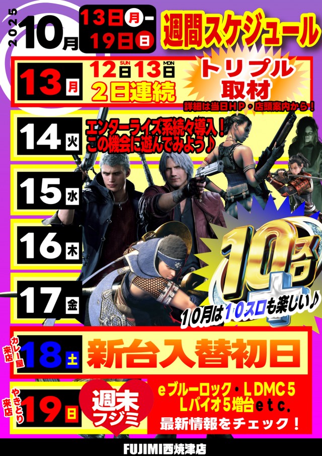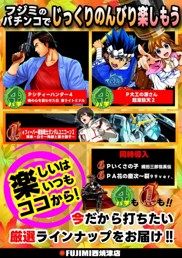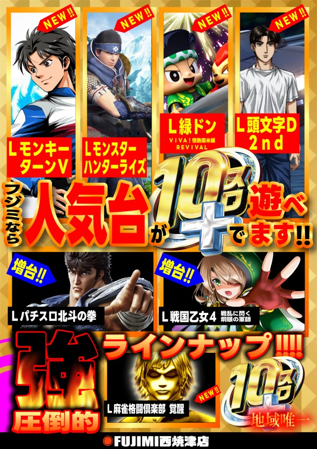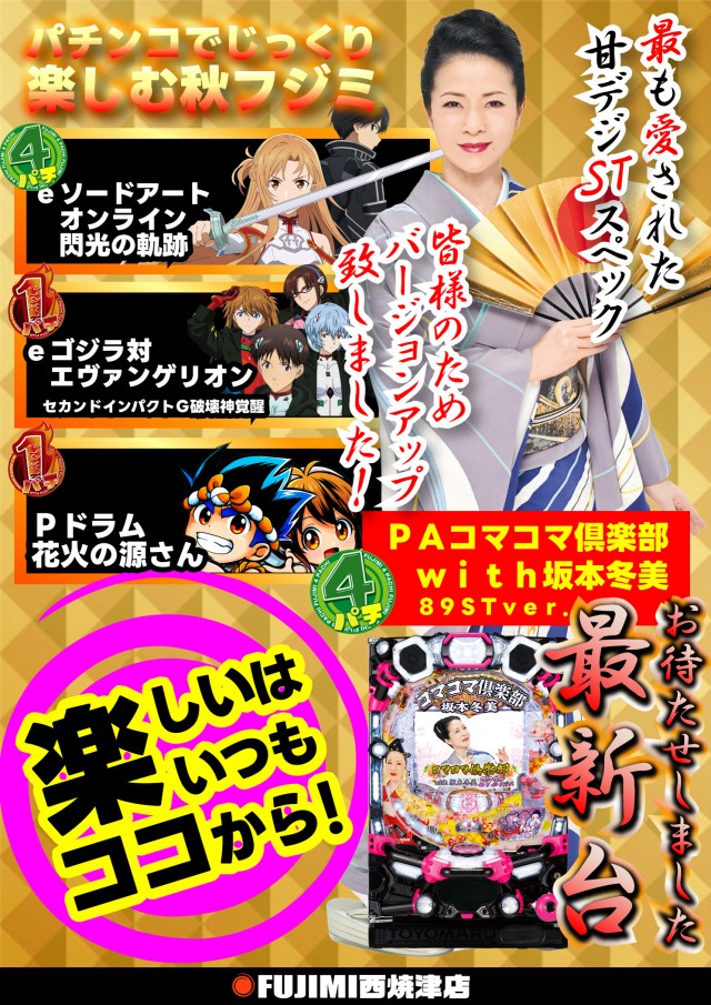 - FUJIMI西焼津店 ご来店頂いたお客様への感謝の気持ちを大切に!!遊びやすさ地域No.1を目指します!! 小さい店ではありますが、大きな店舗様に負けないよう、ご来店の際には満足して楽しんで頂けますよう日々の営業を行っております。 【楽しいはいつもココから】 FUJIMI西焼津店でお気に入りの機種でご遊技していだだき、明るいスタッフに癒されに・・・ 是非ともご来店心よりお待ちしております。