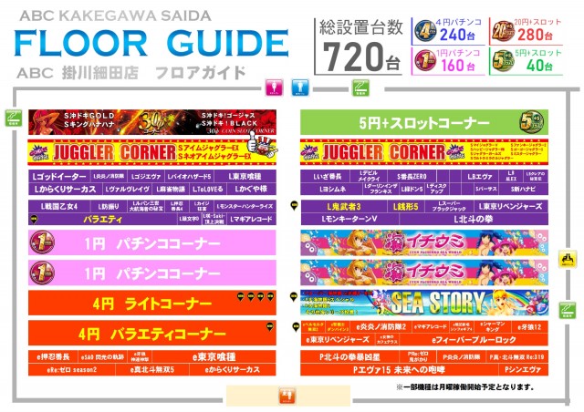 - [4]パチ:240台 [1]パチ:160台 [21.74]スロ:280台 [500円90枚]スロ:40台