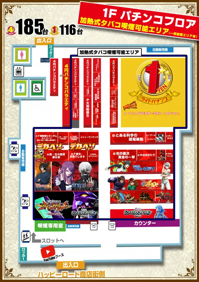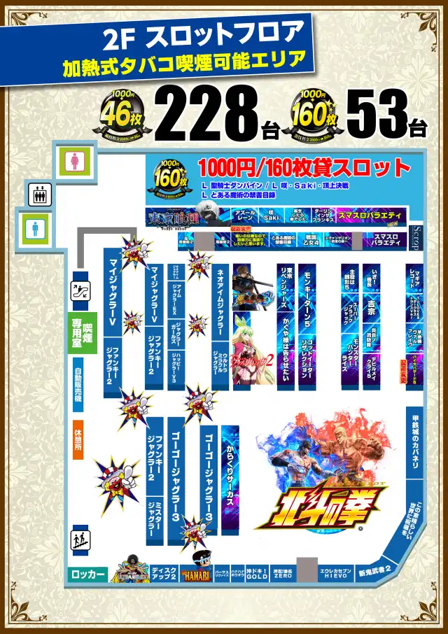 - 4パチ:185台 1パチ:116台 1000円/46枚スロ:228台 1000円/160枚スロ:53台
