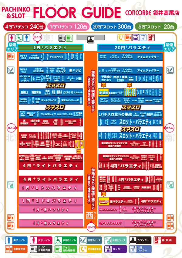 - パチンコ 360台 / スロット 320台 4.38パチ:240台 1.11パチ:120台 1000円/46枚スロ:300台 1000円/180枚スロ:20台