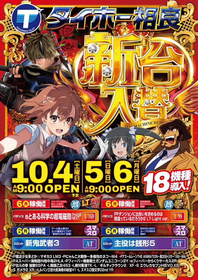 - 新レートに加えて貯玉・貯メダルの乗り換えが可能に!! 装い新たに店内設備も充実!!パチンココーナー全台に便利なパーソナルシステムを導入しました! 当店スタッフへお気軽にお問い合わせください☆ タイホー相良は地域の皆様に愛されるお店作りを目指してまいります!!